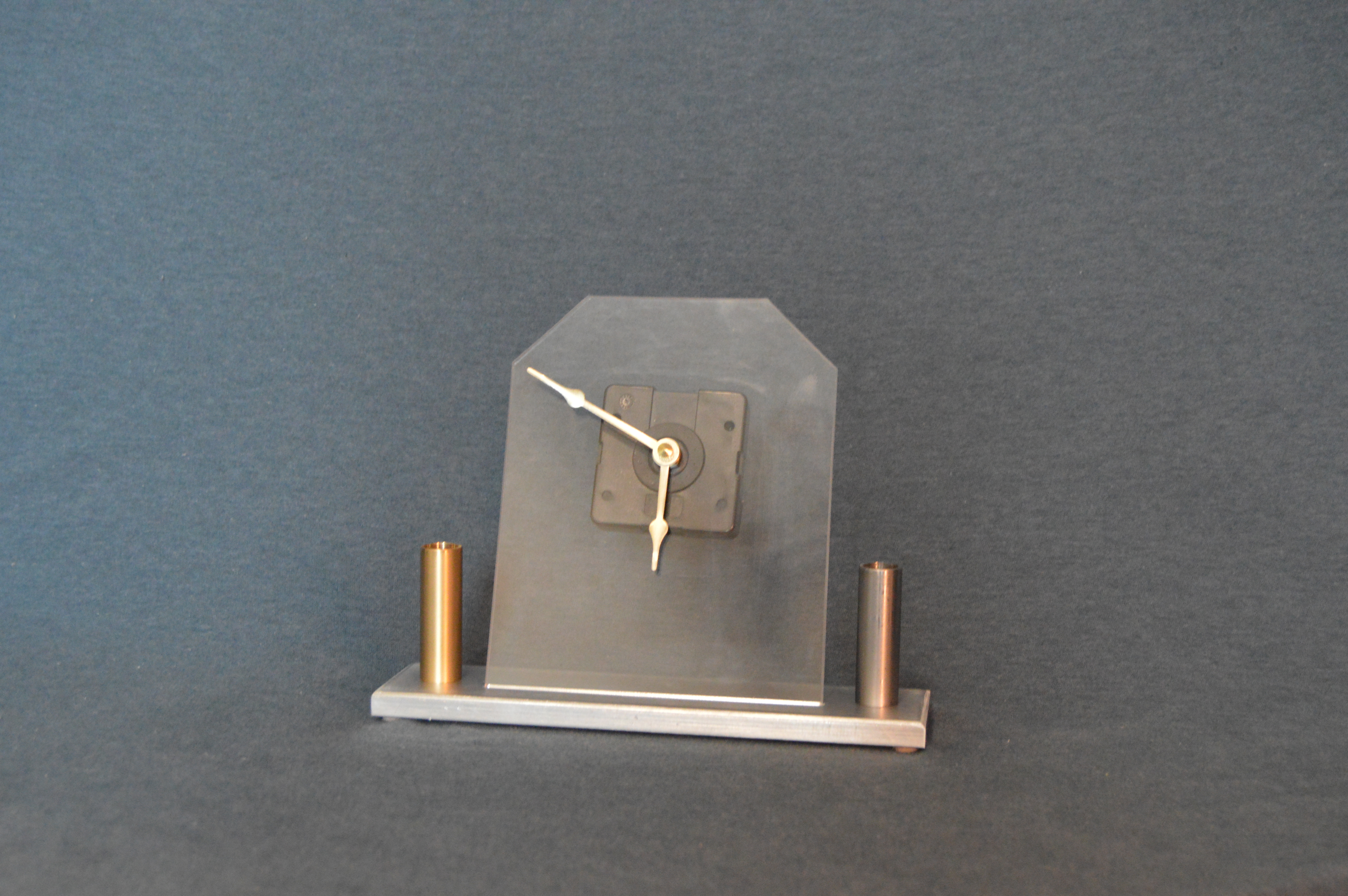 This was the first project completed in Mech 200B The clock project was the culmination of two main manufacturing processes, milling and turning. The main intention of this project was to introduce people to the concepts that they may run into during future courses and careers. It is composed of an aluminum base, a brass pencil holder, a steel pen holder, and an acrylic clock face. These components all had tolerances applied to them, many of which were +- .005, and completed on a manual machine.