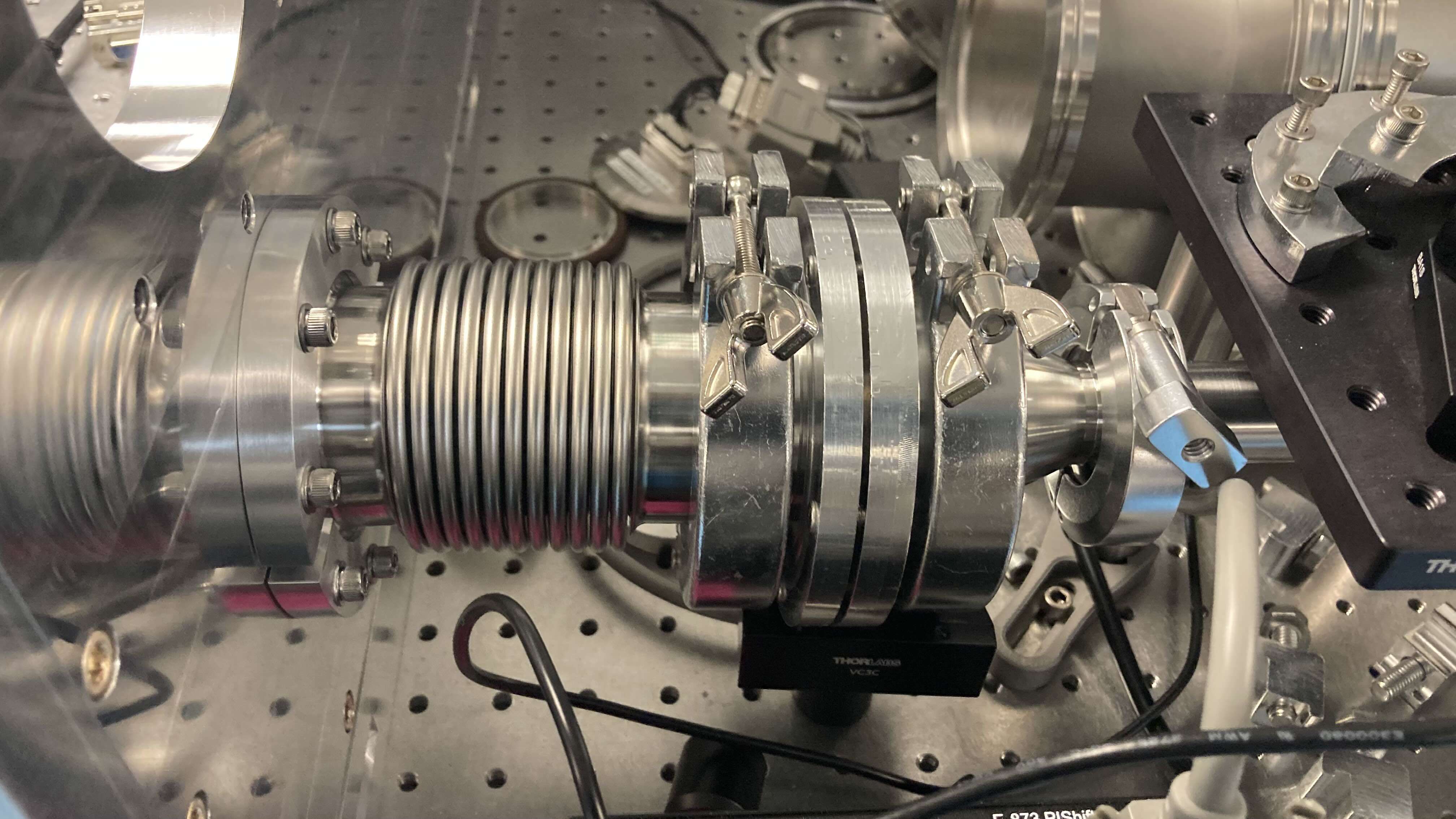 A new technology on this laser line is its use of a 4-meter hollow core fiber optic. This fiber optic is then filled with helium gas to broaden the spectrum of the laser pulse. The beam must pass through the fiber optic then into vacuum with minimal distortion. A .5mm thick sapphire window provides the barrier between the ~2 bar of helium to high vacuum.